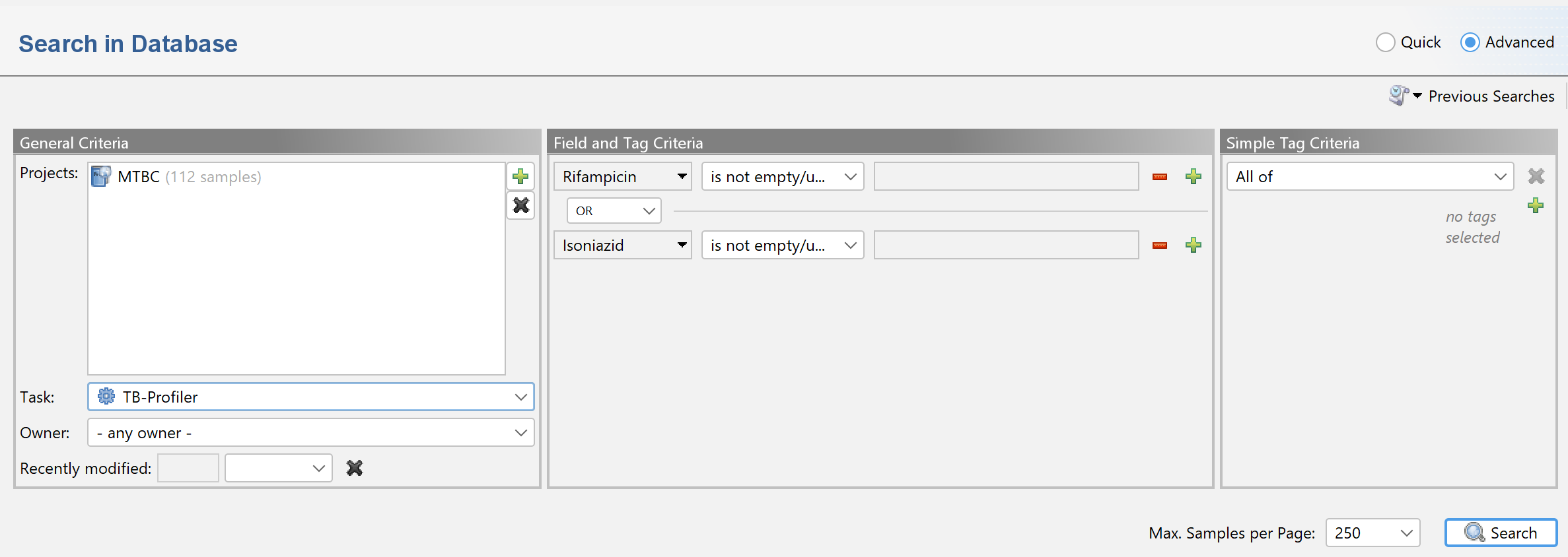 Note that search queries can be combinded by Boolean operators (e.g., AND or OR). For example, to search for samples with a reported resistance to rifampicin or isoniazid use Rifampicin is not empty/unknown OR Isoniazid is not empty/unknown: