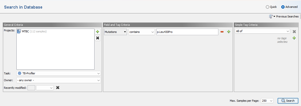 To search for a sample with a specific mutation use a query like Mutation contains p.Leu430Pro.