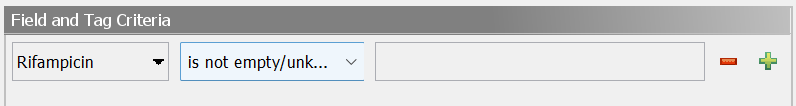 As an example, to search for samples with reported rifampicin resistance, Rifampicin is not empty/unknown can be used in the advanced search samples dialog: